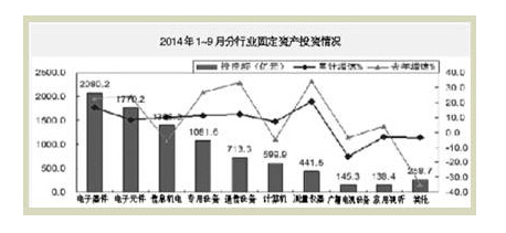 2014年1~9月,電子信息產業固定資產投資持續呈趨緩態勢,電子器件行業投資持續回落,家用視聽和信息材料等領域投資仍下滑,電子元件、計算機和通信行業投資增速放緩,新開工項目依然不足。主要特點如下: